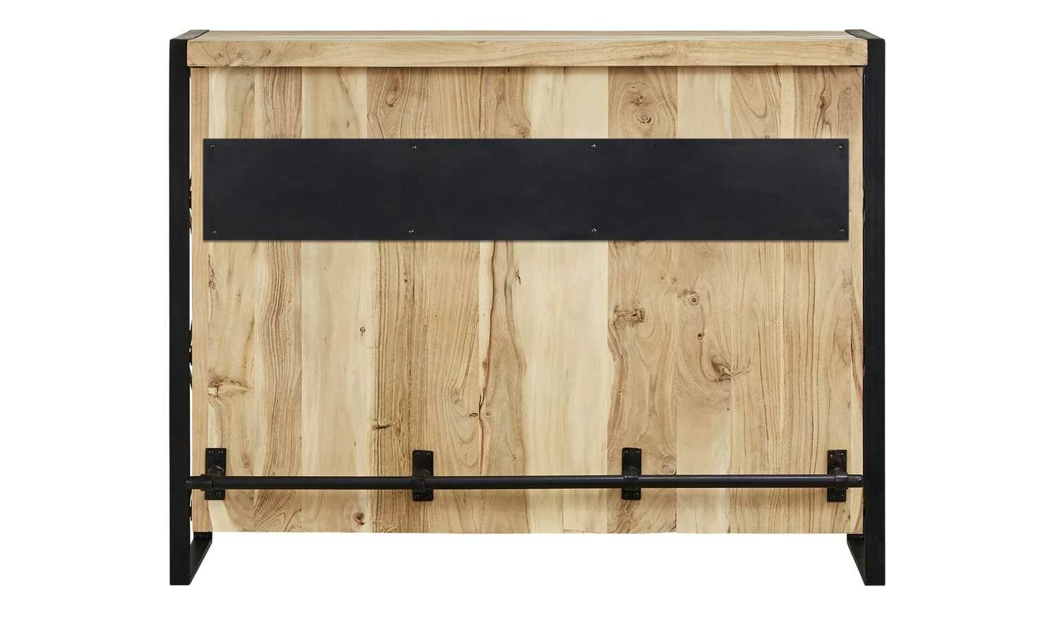 - Mehr zum Material: Fußstange und Zierblende: Metall, lackiert, Ablageplatten, Tischplatte und Front: Akazie natur massiv, gebeizt und lackiert