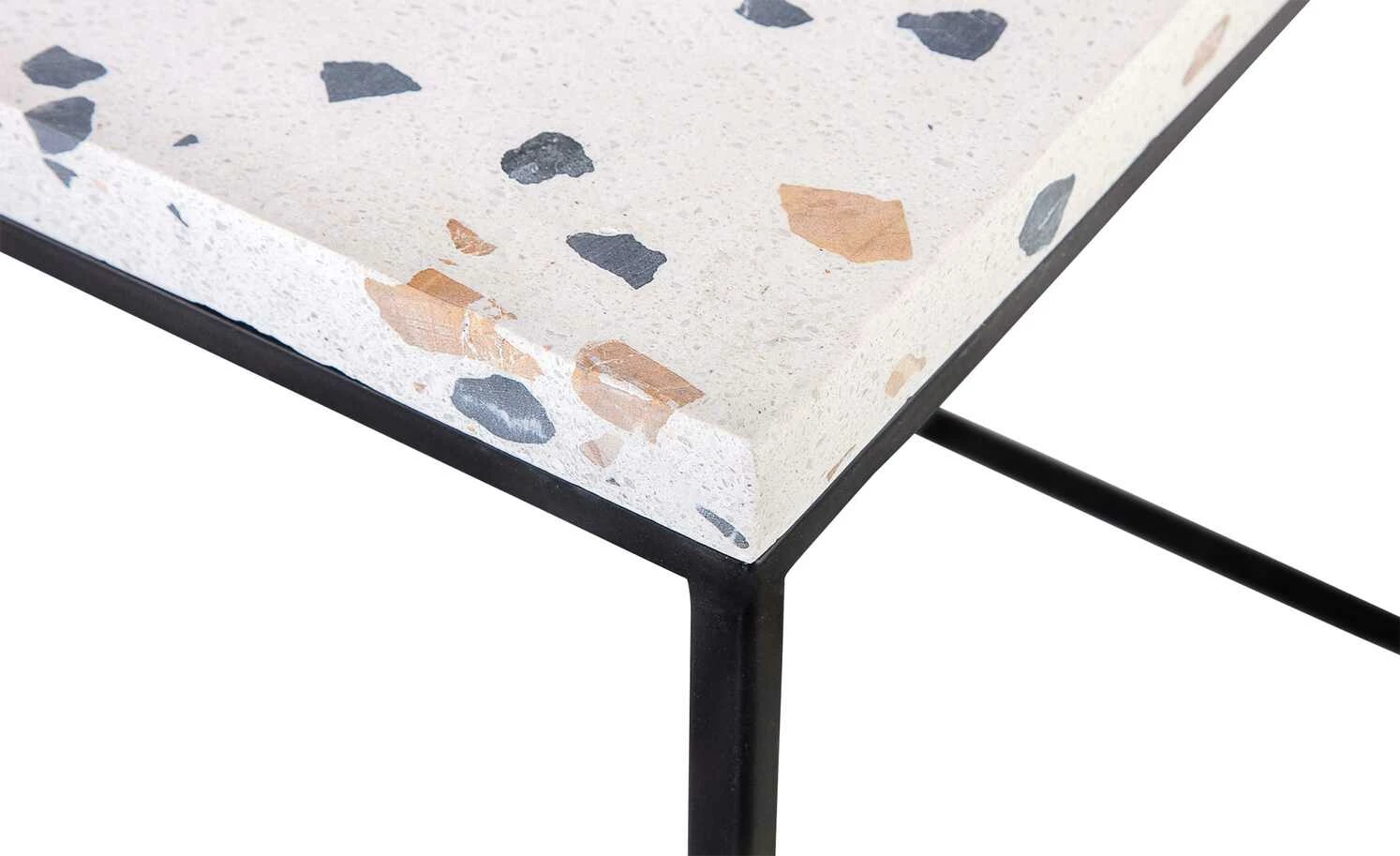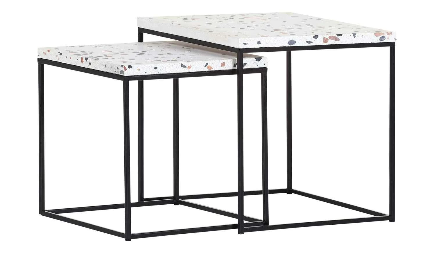 Diese beiden Beistelltische stechen durch ihre Terrazzo-Machart sofort ins Auge. Die quadratischen, weißen Tischplatten sind mit trendigen, unregelmäßig verteilten Farbakzenten versehen. Getragen werden sie von kubistischen Metallgestellen in Schwarz, welche einen bewussten Kontrast bilden. Schieben Sie den kleineren Tisch ganz einfach unter den größeren oder platzieren Sie die Tische separat voneinander: Ihrer Gestaltungsfreiheit sind keine Grenzen gesetzt.