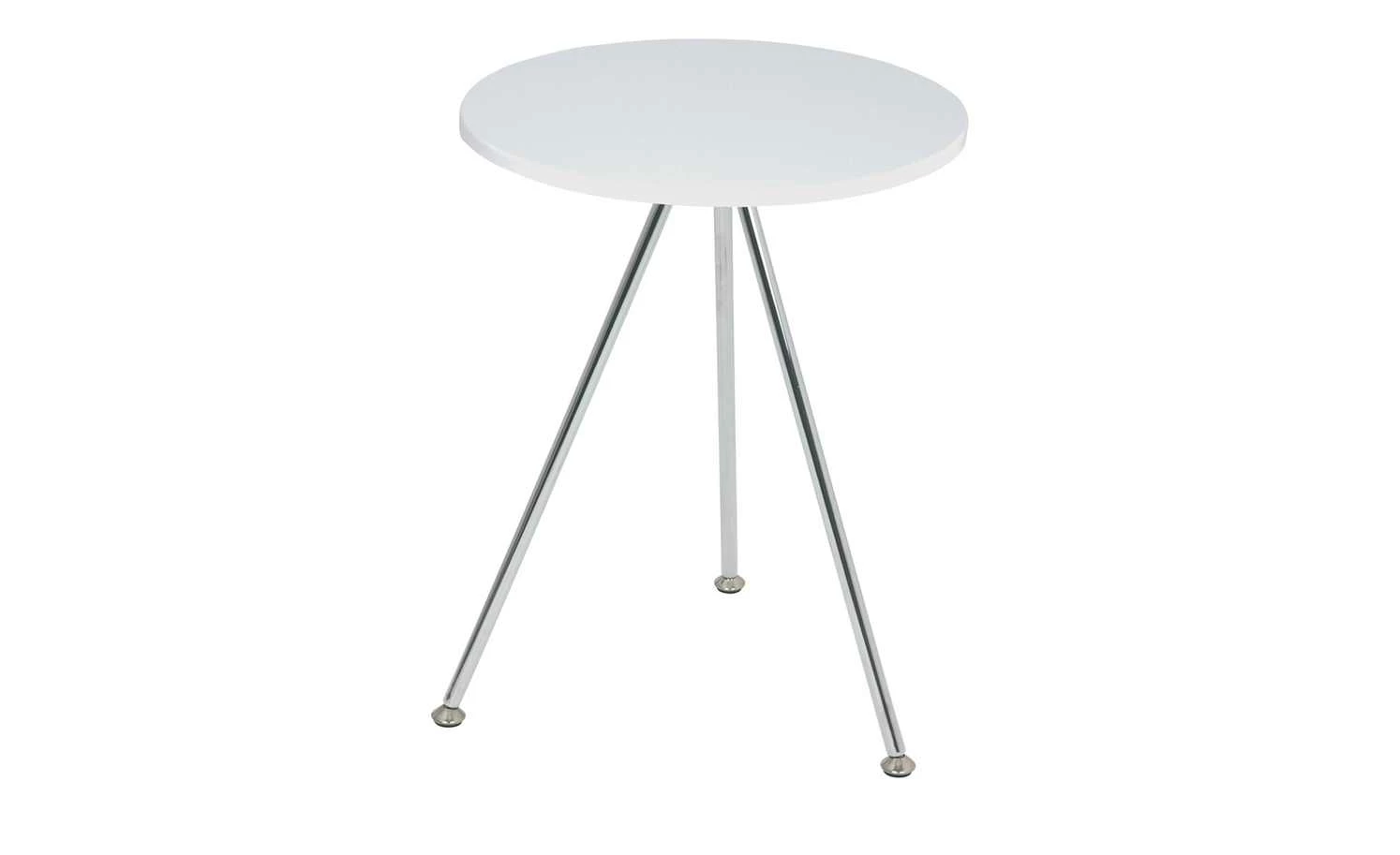 Hürth ist ein moderner kleiner Beistelltisch. Die runde Tischplatte fällt durch ihr strahlendes Weiß auf. Durch das Hochglanzfinish wirkt der Farbton noch leuchtender und eleganter. Drei Tischbeine aus verchromtem Metall sorgen für einen soliden Stand und setzen sich dekorativ ab.