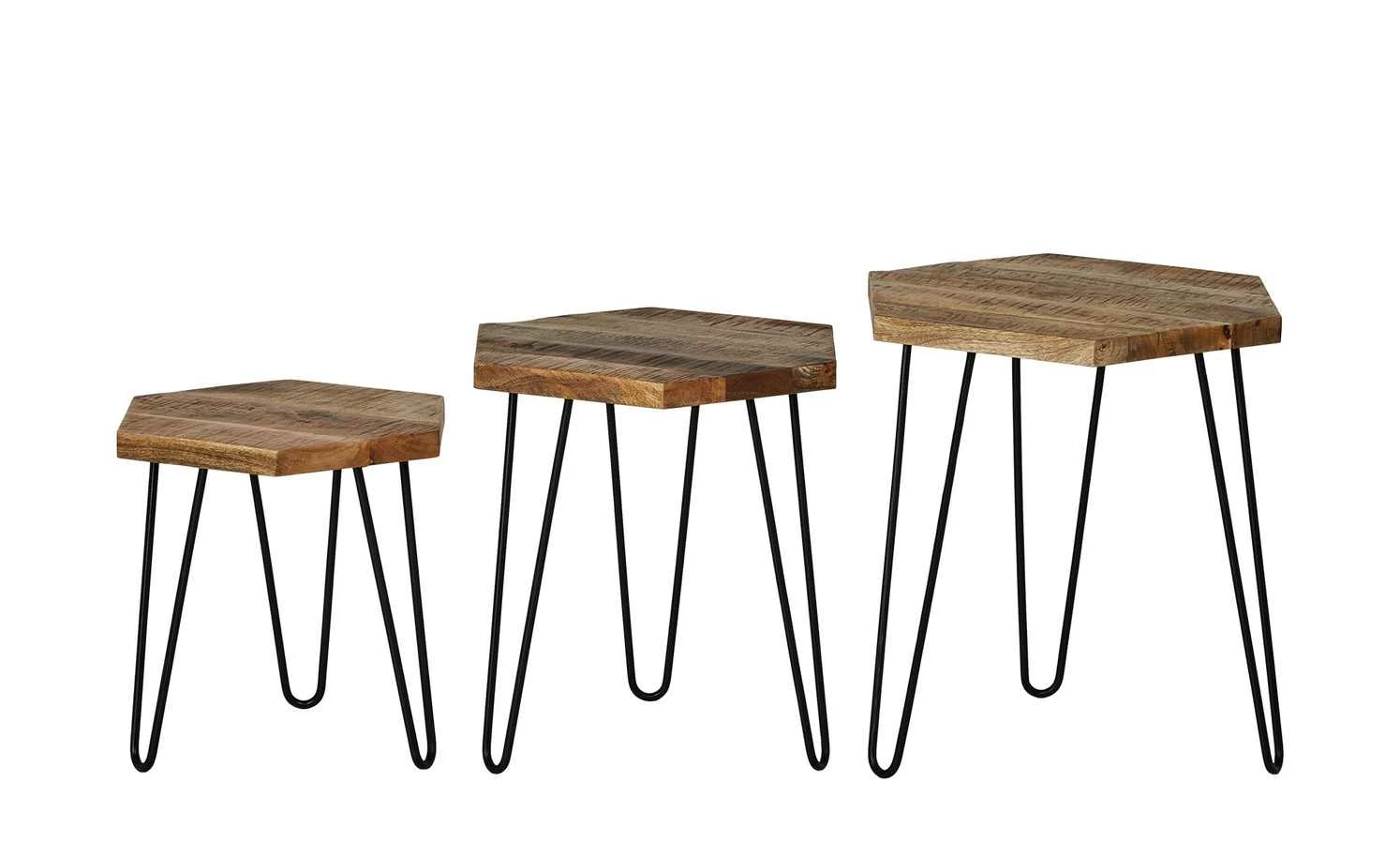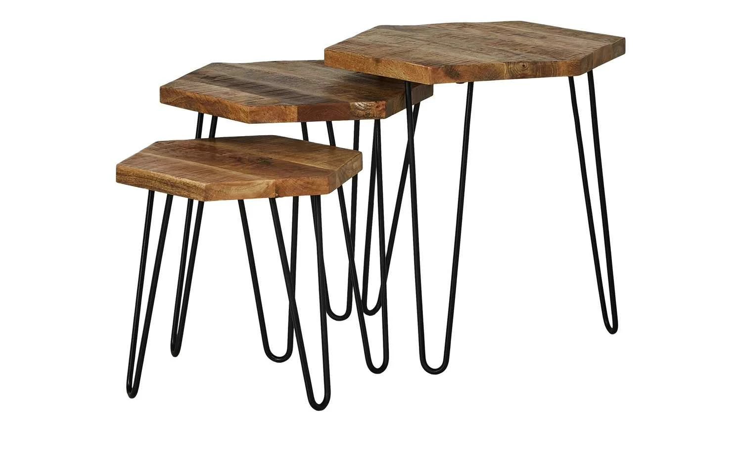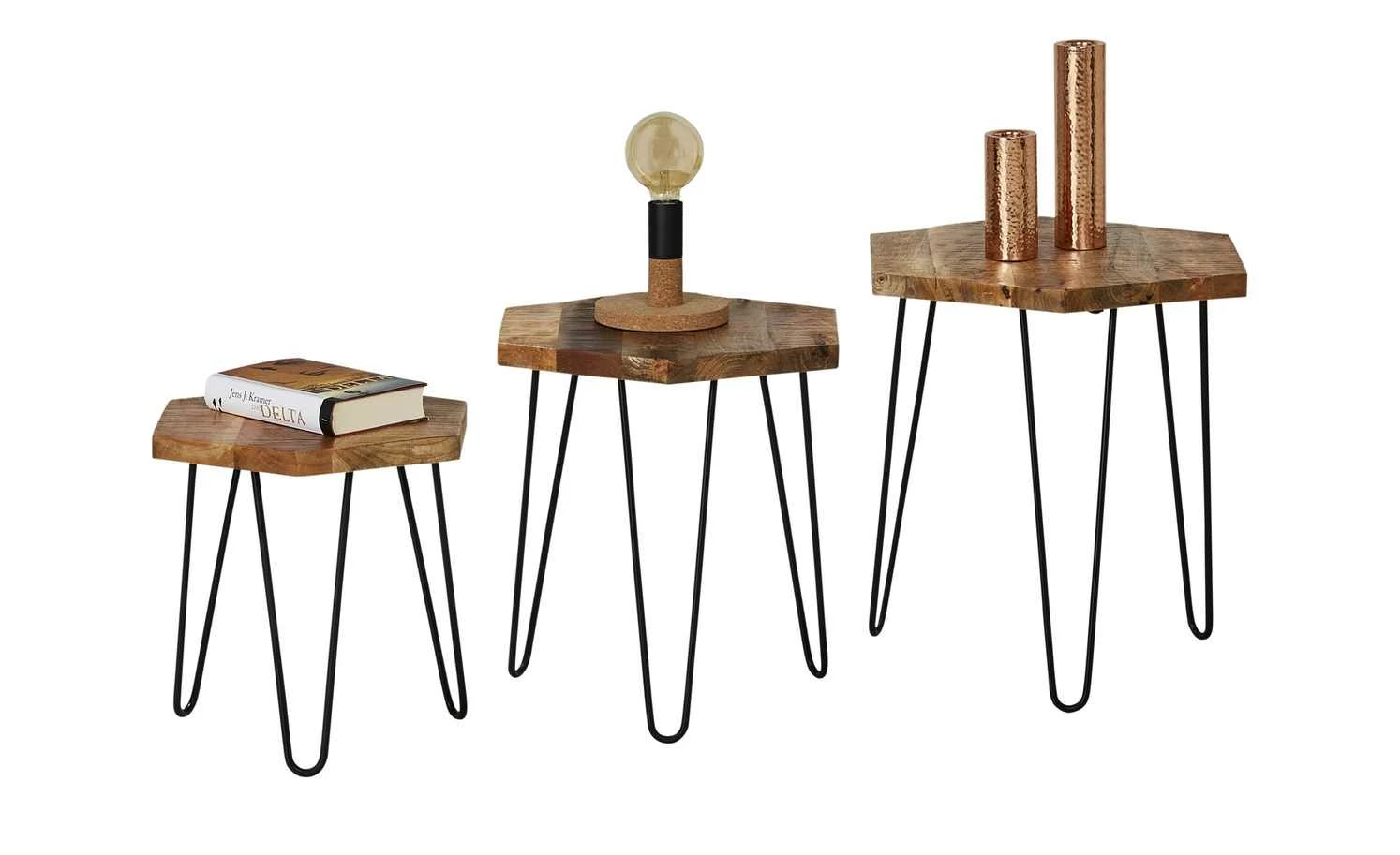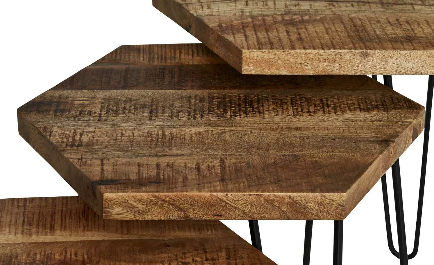 Das 3er-Set Velletri besteht aus drei unterschiedlich großen Beistelltischen. Kernstück aller Tischchen sind die hexagonalen, drei Zentimeter starken Tischplatten aus massivem Mangoholz. Diese werden von einem trendigen, pulverbeschichtetem Eisengestell in Schwarz getragen. Durch diese Materialkombination verströmen die Beistelltische ein ganz besonderes Flair.