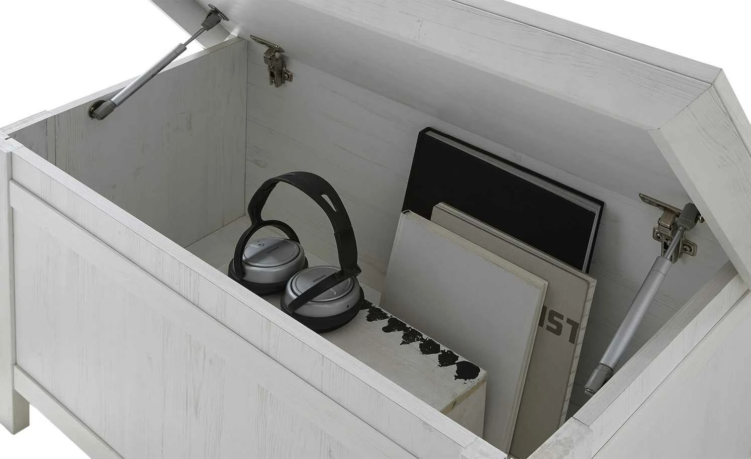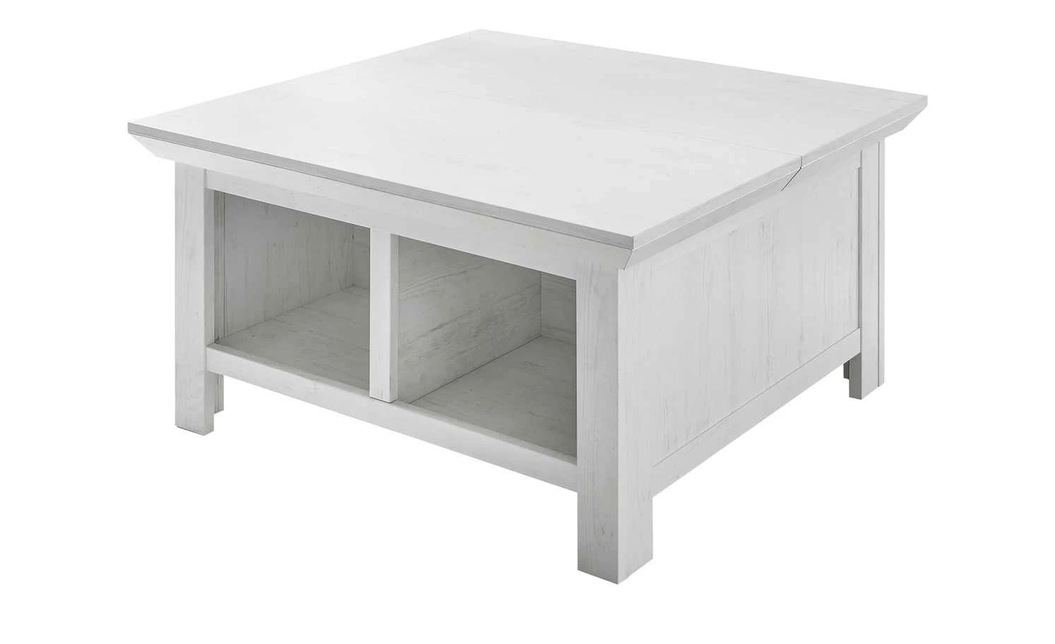 Der Couchtisch Atina ist im Landhausstil designt, wirkt dabei aber dezent und geradlinig. Er hat ein Dekor in weißer Pinie (Nachbildung), das über eine feine Maserung verfügt. Die quadratische Tischplatte ist zweigeteilt. Eine Seite lässt sich aufklappen, so dass Sie an den Stauraum darunter gelangen. Auf der anderen Seite befinden sich zwei seitlich zugängliche Fächer.