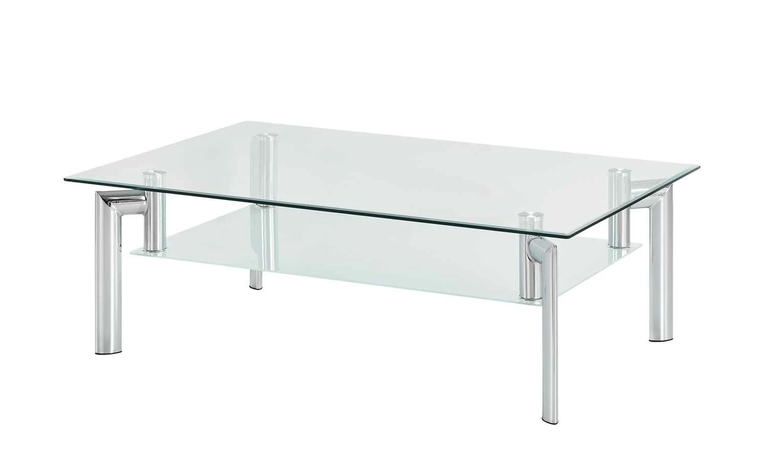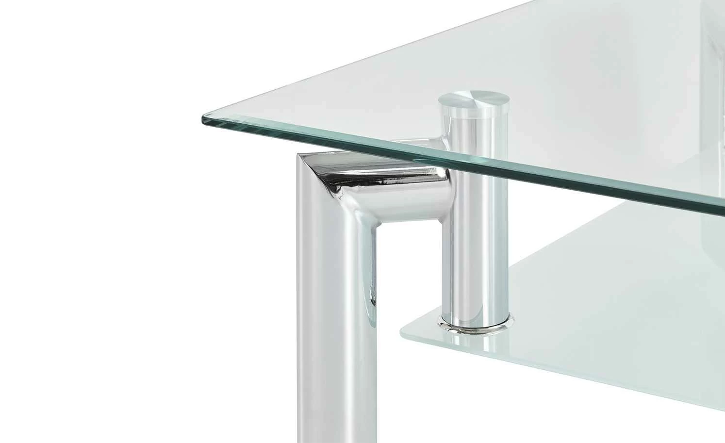 Glas und Metall im Mix sind zeitlos attraktiv. Das sehen Sie auch beim Couchtisch Bela I. Das Gestell ist aus verchromtem Metall gefertigt. Es sorgt für einen stabilen Stand und eleganten Glanz. Die rechteckige Tischplatte besteht aus klarem Sicherheitsglas. Der gesamte Rand ist mit einer dekorativen Facette – also einem speziellen Schliff – versehen. Die zusätzliche Ablage ist ebenfalls aus Sicherheitsglas gefertigt, wobei es mit seiner gefrosteten Optik punktet und sich so von der Tischplatte absetzt.