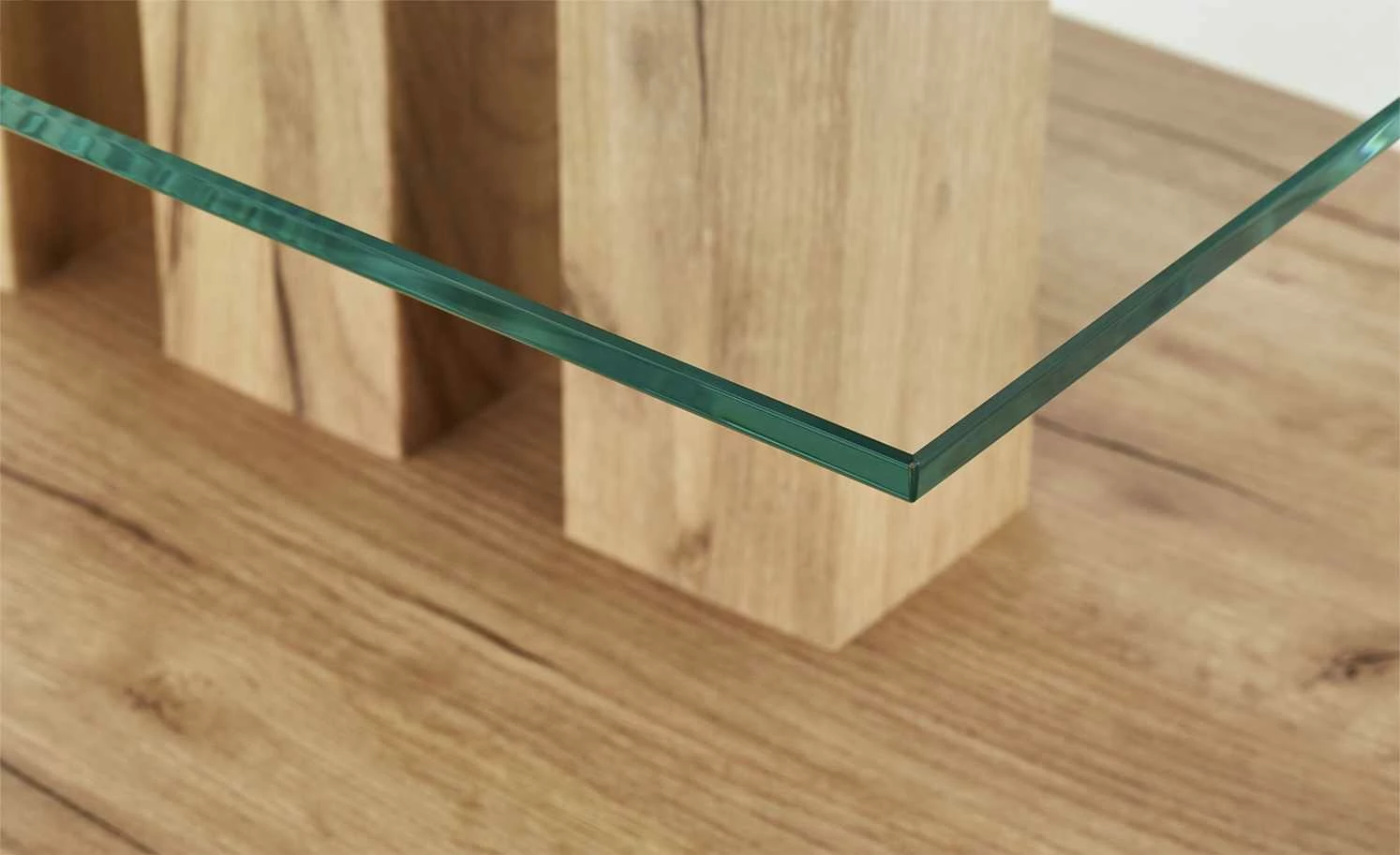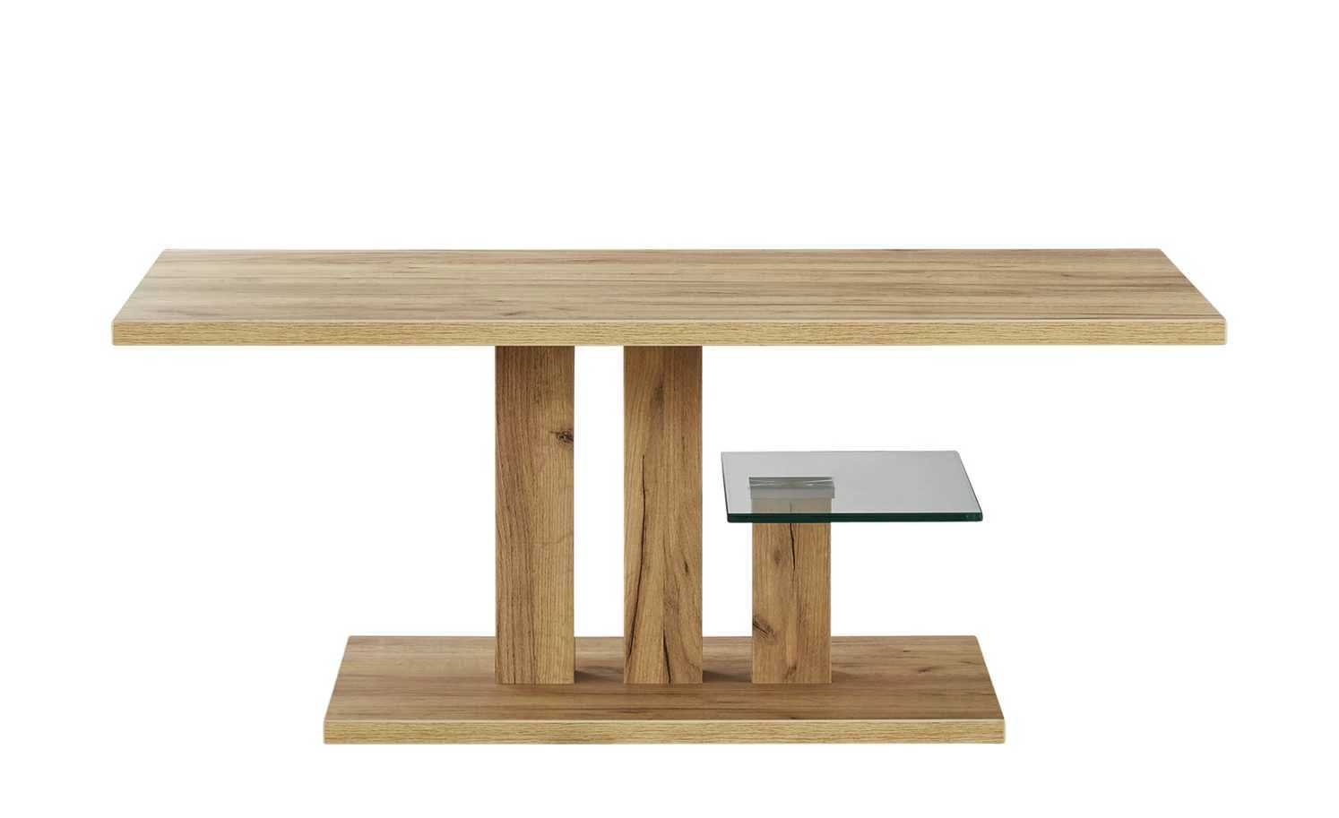 Der Couchtisch Cortina verfügt über eine kleine Ablage aus Glas. Der Rest des Tisches hat ein attraktives Dekor in Wildeiche (Nachbildung). Das Gestell hat eine Säulenform mit Bodenplatte. Dabei tragen drei Säulen Tischplatte und Ablage.