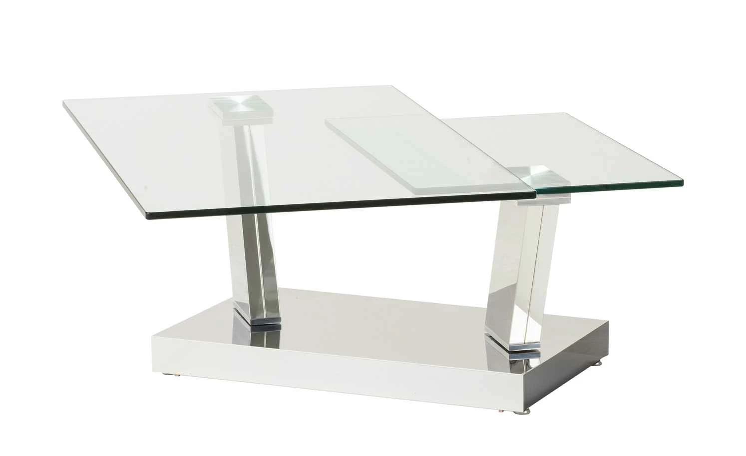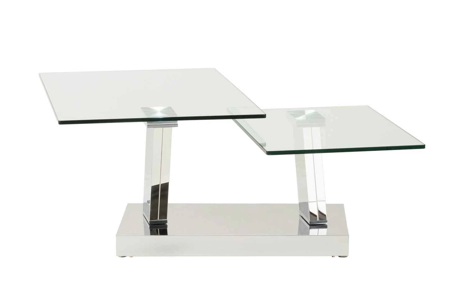 Die Materialwahl aus poliertem Edelstahl und Glas ergeben bei diesem Couchtisch Budelli einen eleganten und puristischen Look. Einen futuristischen Eindruck erhält man durch seine besondere drehbare Funktion. Die zwei Tischplatten werden synchron gedreht und können stufenlos ausgerichtet werden, wobei der Verstellmechanismus sehr leichtgängig ist. Die größere, obere Tischplatte kann dabei die kleinere überlagern, oder gar komplett verdecken. Sie entscheiden selbst, wie viel Fläche Sie benötigen. Das macht diesen Couchtisch Budelli nicht nur vielseitig in der Anmutung, sondern auch komfortabel und flexibel in der täglichen Anwendung in Ihrem Zuhause.