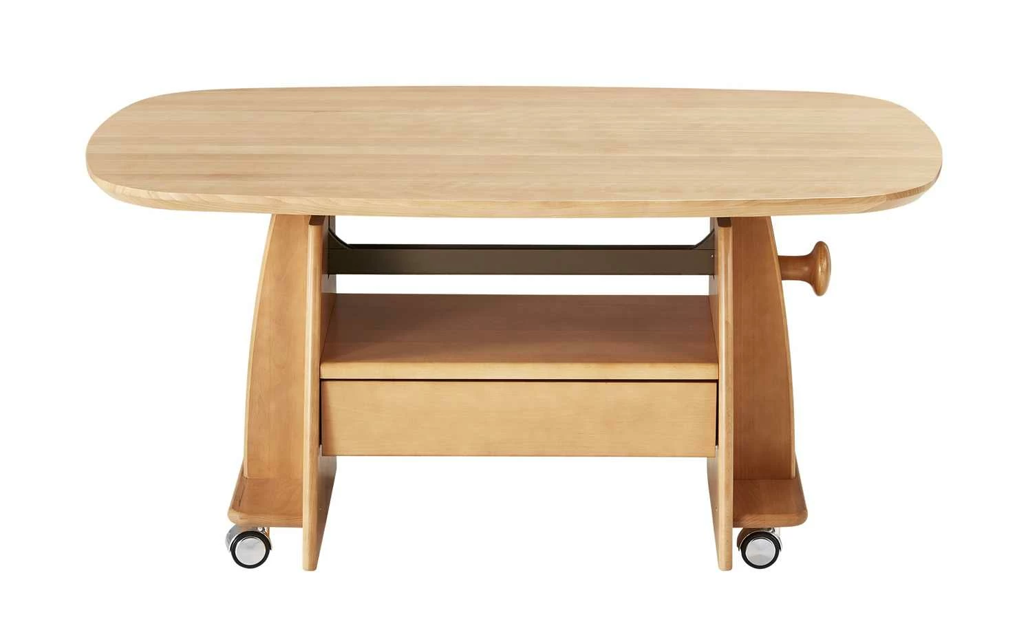 Der Couchtisch Hamal besticht mit seiner funktionalen Ausstattung. Sie können den Tisch in der Höhe verstellen. Das ist von 50 auf bis zu 60 Zentimeter möglich. Der Regler zum Verstellen befindet sich seitlich am Gestell. Hamal ist mit vier Rollen ausgestattet. Bewegen Sie den Tisch einfach dorthin, wo Sie ihn benötigen. Neben der ovalen Tischplatte bietet Hamal auch eine Ablage. Direkt darunter finden Sie eine geräumige Schublade. Der Tisch ist aus hochwertigem Buchenmassivholz gefertigt. Es bietet natürlichen Charme und punktet mit seiner Qualität.