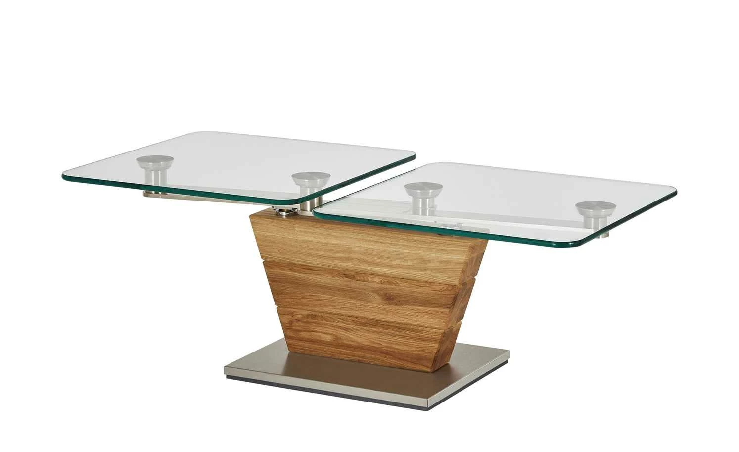 Der Couchtisch Han ist ein optisches und funktionales Highlight für Ihren Wohnraum. Praktisch: Die beiden Tischplatten können Sie je nach Bedarf in die passende Position bewegen. Die integrierte Dreh- und Schwenkmechanik macht es möglich. Sie ist aus hochwertigem Edelstahl gefertigt. Die Tischplatten selbst sind aus Klarglas. Es ist stabil und leicht zu reinigen. Für einen sicheren Stand sorgt das Gestell in Säulenform. Für die Säule ist massive Asteiche verwendet worden. Das Holz ist stabil und langlebig. Gleichzeitig verfügt es über eine rustikale Maserung mit Struktur- und Farbunterschieden. Ein Eyecatcher sind die holztypischen Asteinschlüsse. Sie geben der Asteiche ihren Namen.