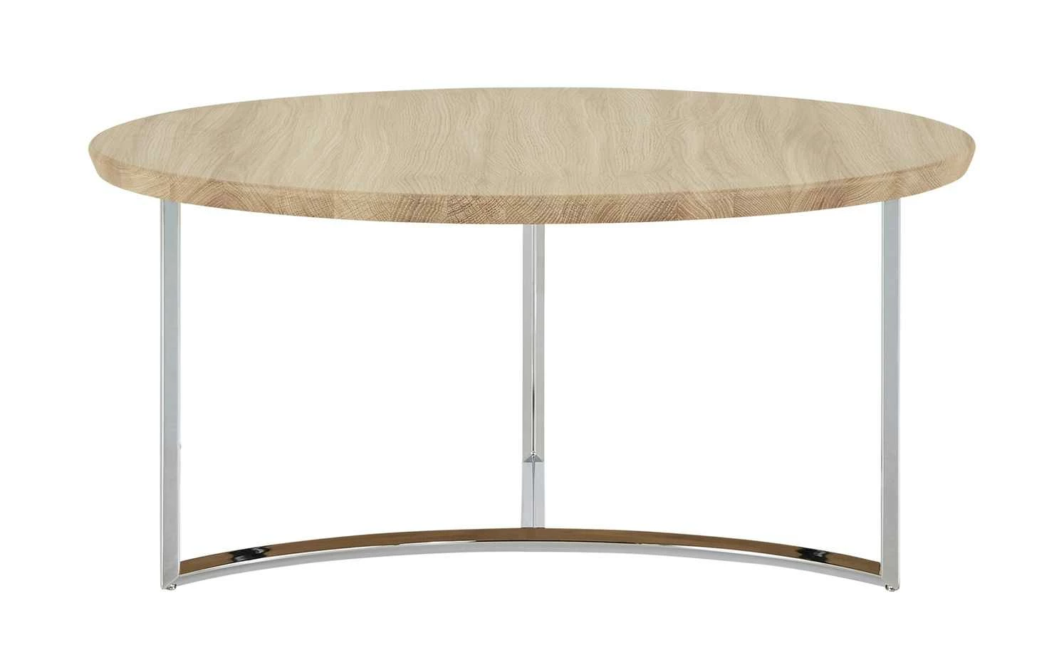 Der Couchtisch Moon ist ein cooles It-Piece für Ihr Wohnzimmer. Die runde Tischplatte aus massiver Asteiche wird von einem Designgestell aus Metall getragen. Dabei treffen sich die drei Tischbeine in der Mitte und ergeben zwei Kufen. Eine der beiden ist halbrund designt und erinnert an die Sichel des Mondes. Die verchromte Oberfläche ist hochglänzend und setzt sich dekorativ von der Asteiche der Tischplatte ab.