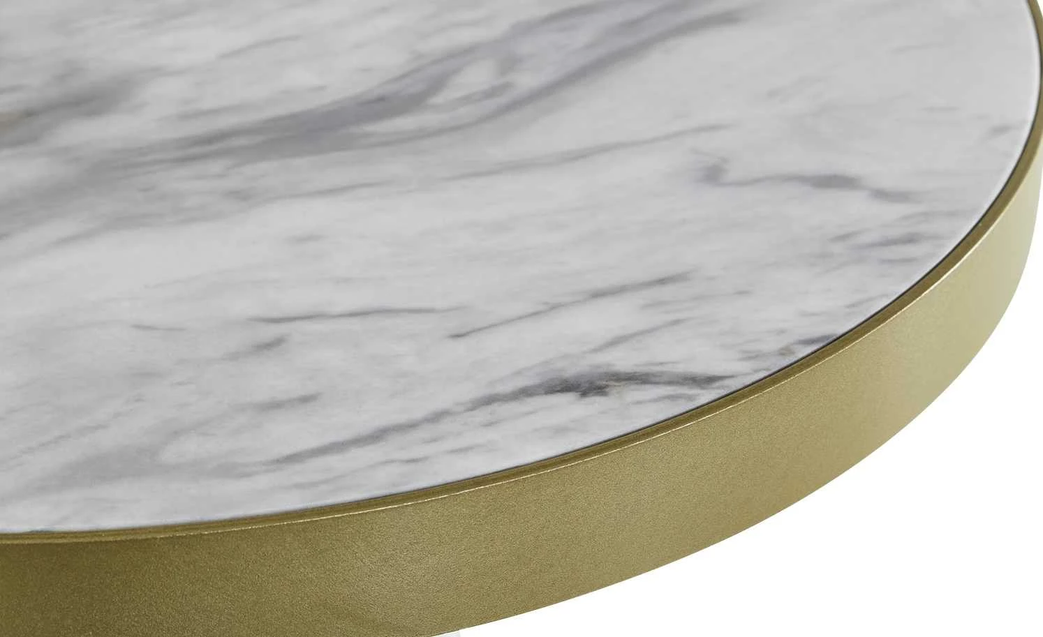 Marmor liegt wieder voll im Trend. Und wie klasse das Material wirkt, beweist auch der Couchtisch Ustica. Er hat eine ausgeprägt marmorierte runde Tischplatte in Marmor Weiß (Nachbildung). Sie wird von einem Rand in Goldoptik abgesetzt. Dieses Finish wiederholt sich an den weißen Tischbeinen. Sie sind am unteren Ende ebenfalls in Goldoptik abgesetzt. Alles zusammen ergibt einen tollen glamourösen Look.