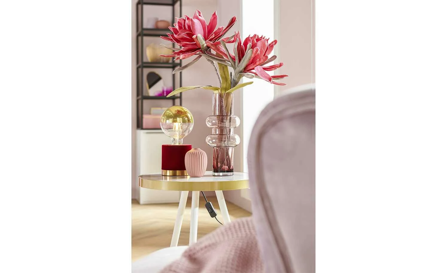 - Mehr zum Material: Tischplatten-Rahmen und Gestell-Absetzung: Metall, goldfarbig lackiert