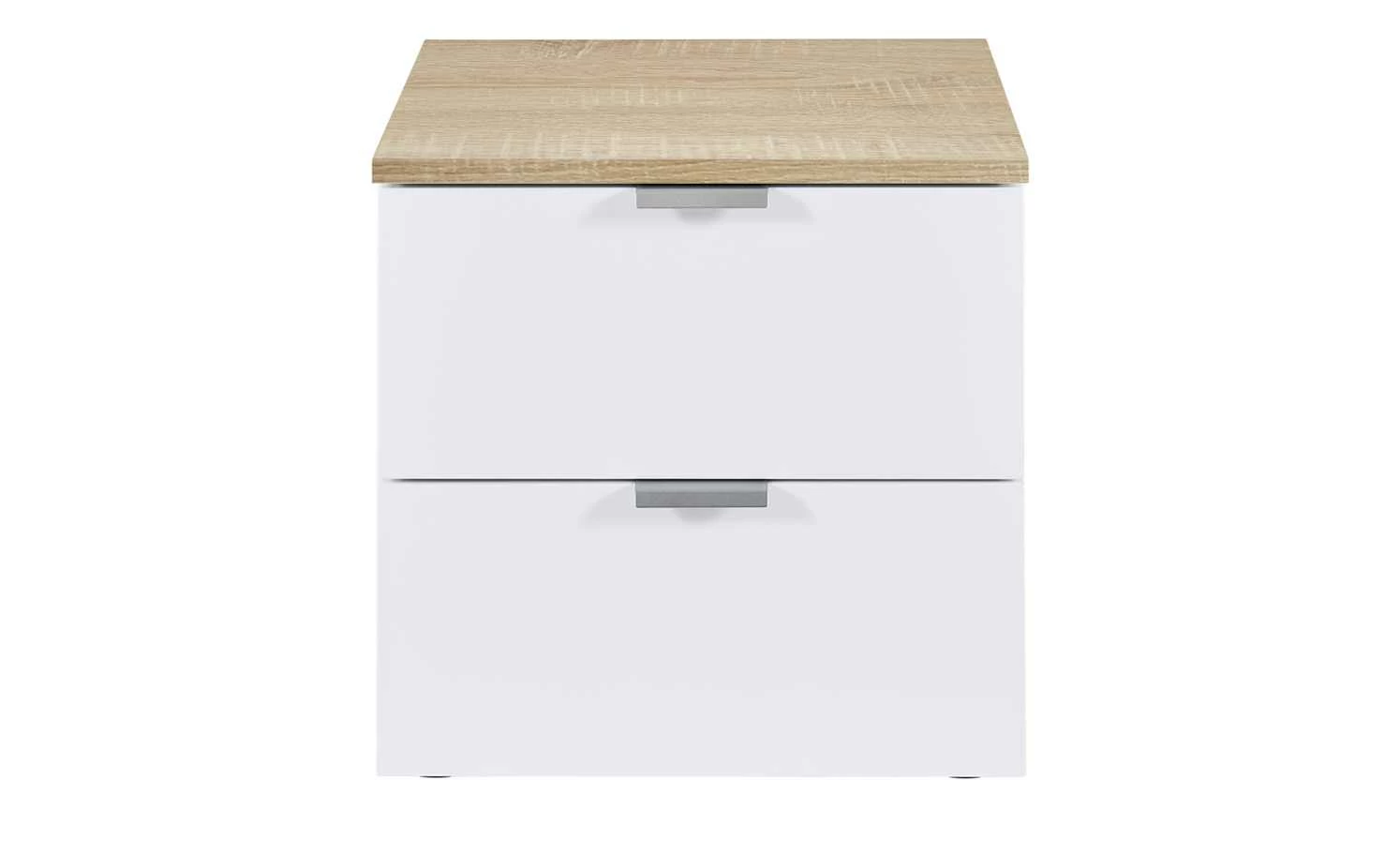 Passend zum Schrank Dreamer und dem gleichnamigen Sideboard ist diese Nachtkommode. Sie ist mit zwei Schubfächern ausgestattet. Diese haben einen sogenannten Softeinzug. Das heißt, dass die Schubladen leise schließen. Die alufarbigen Griffe sind aus Metall und setzen Akzente. Dreamer fällt durch seine strahlend weiße Front auf. Sie hat einen eleganten Glanz. Kontrastreich dazu ist der Korpus in Eiche sägerau (Nachbildung).