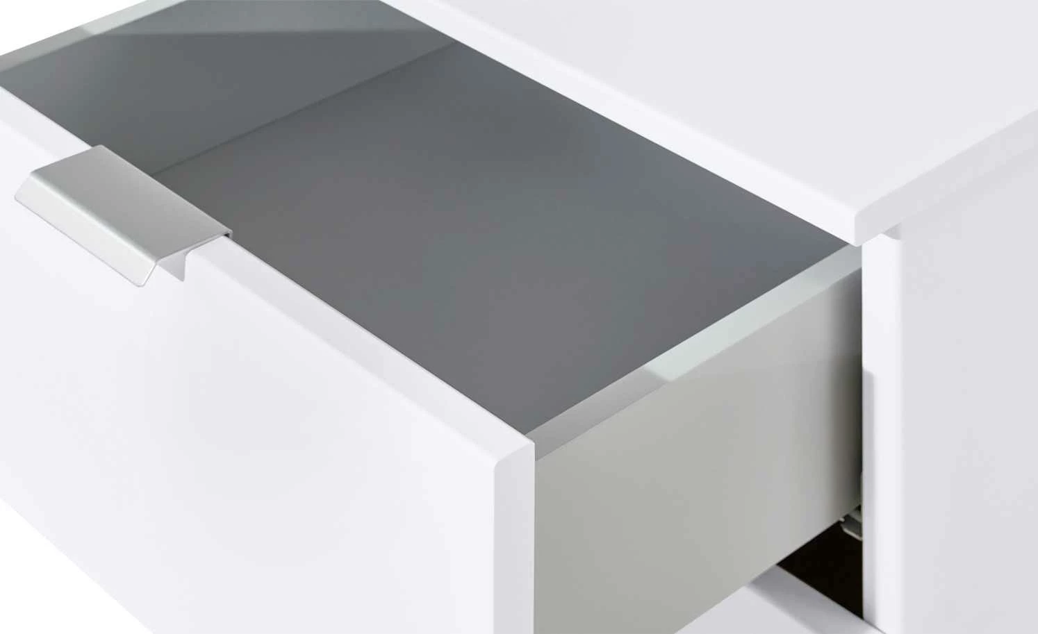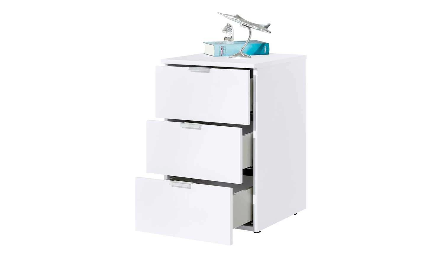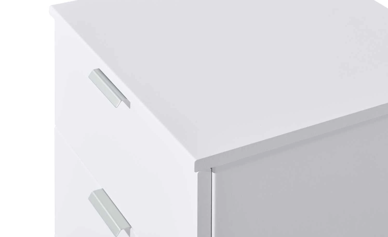 Dreamer ist eine praktische Nachtkommode, die perfekt neben Ihr Bett passt. Das geradlinige Design fügt sich nahtlos in viele Einrichtungsstile ein. Das strahlende Polarweiß lässt die Kommode edel erscheinen und passt zur klaren Formgebung. In den drei Schüben findet alles Platz, was Sie untergebracht wissen möchten. Die Schubfächer werden mithilfe von schmalen Griffleisen aus Metall geöffnet. Sie schließen sich aufgrund des Softeinzuges langsam und leise.