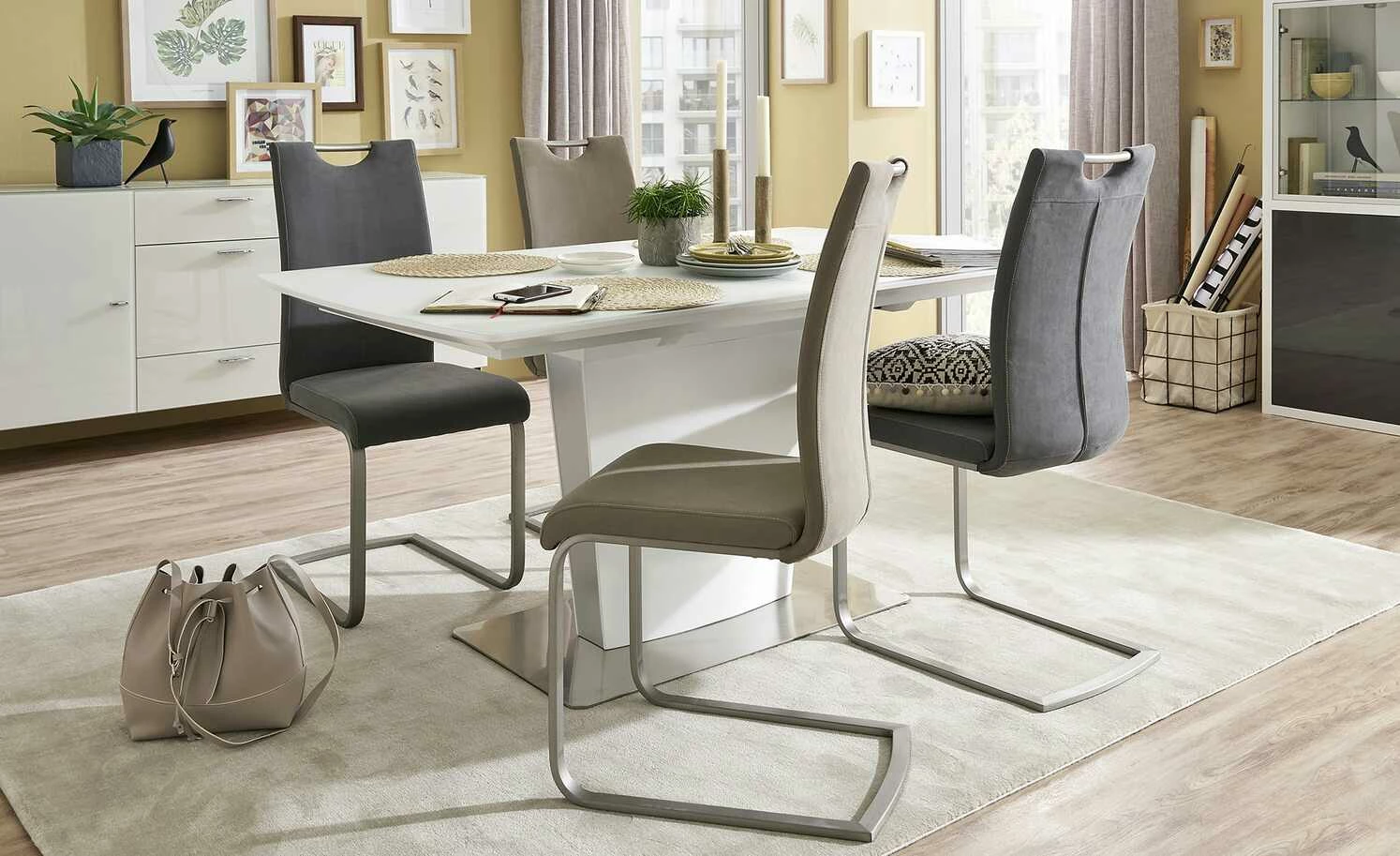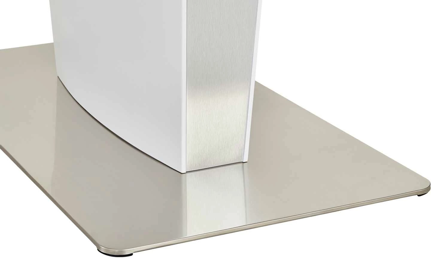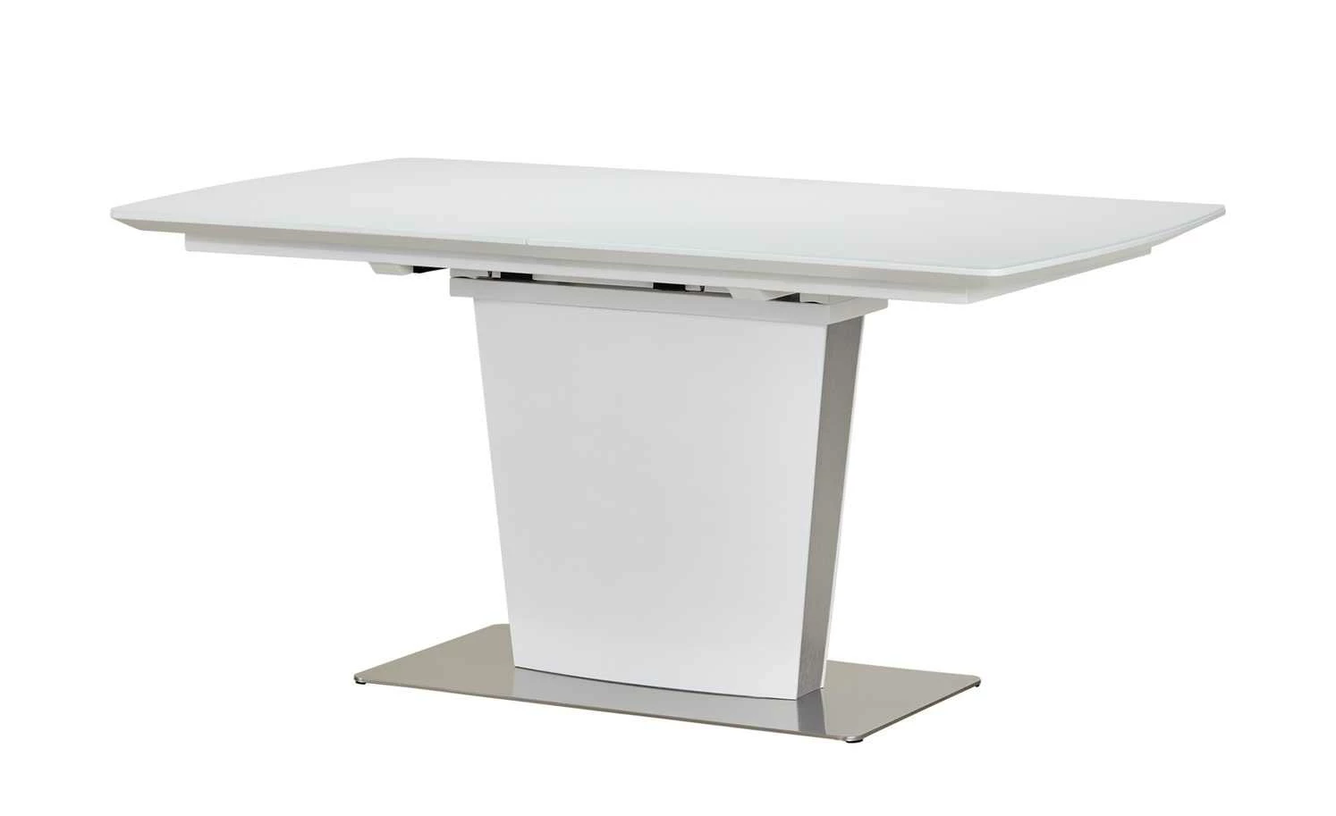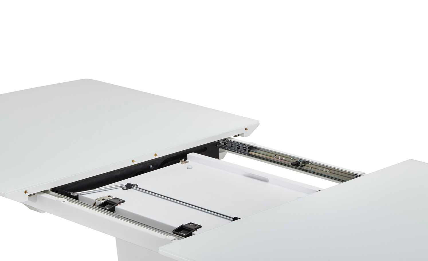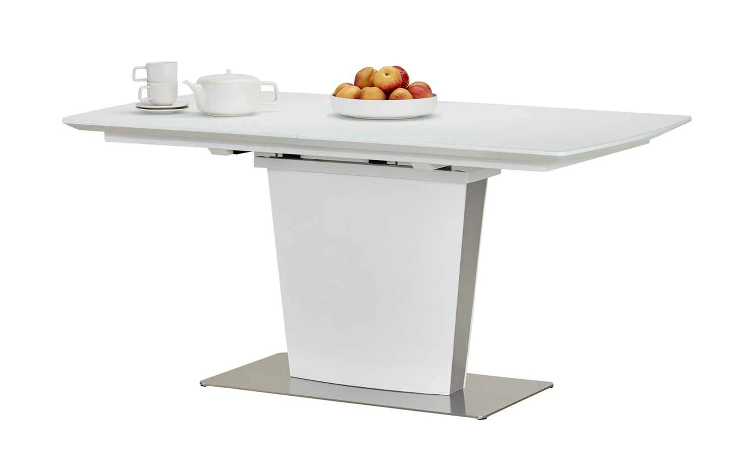 Platz für die gesamte Familie oder viele Freunde bietet Ihnen der Esstisch Dean. Bei Bedarf können Sie ihn einfach verlängern. Möglich macht das die praktische Auszugsfunktion mit Mittelauszug. Das heißt, die Tischplatte wird auseinandergezogen und die mittig unter der Tischplatte versteckte Platte wird ausgeklappt. Dean ist komplett in Weiß gehalten, nur die Bodenplatte und die Absetzungen am Gestell setzen Akzente. Diese sind aus Metall und matt gebürstet. Die Tischplatte ist aus robustem und pflegeleichtem Glas.