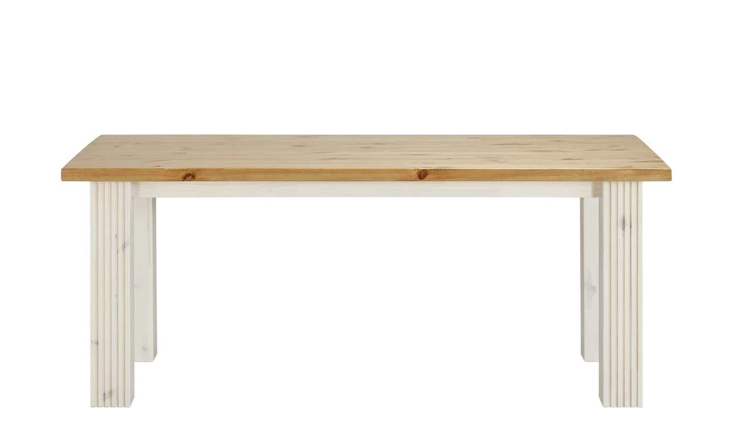 Mit seinem rustikalen Landhauscharme ist der Esstisch Bornholm ein Blickfang für den Essbereich. Bornholm besteht – wie auch die anderen Möbel der Serie – aus massivem Kiefernholz. Die typische Holzmaserung ist sehr gut zu erkennen. Diese natürliche Note passt wunderbar zum Landhauslook. Die vier stabilen Tischbeine sind mit vertikalen Rillen verziert.