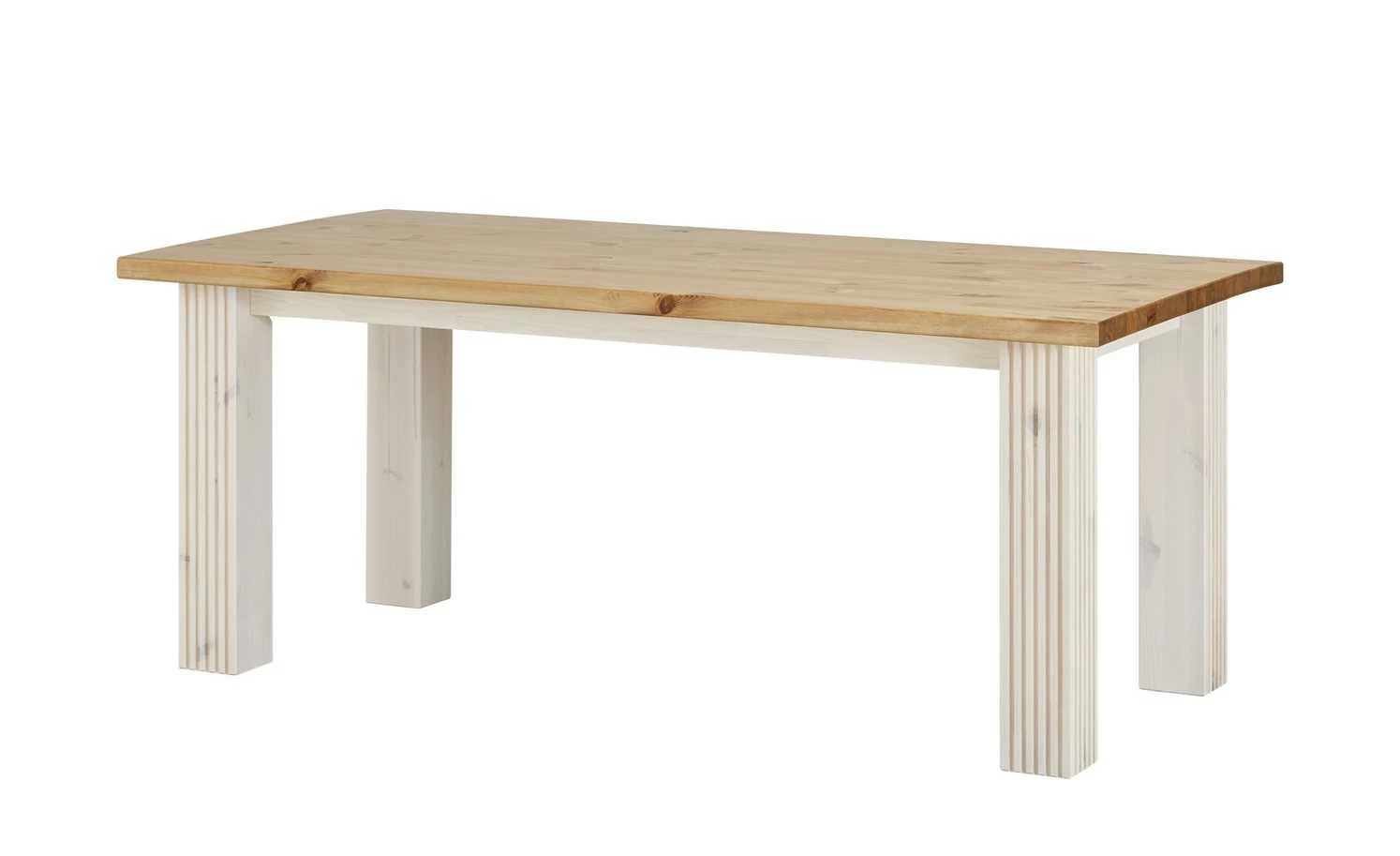 Mit seinem rustikalen Landhauscharme ist der Esstisch Bornholm ein Blickfang für den Essbereich. Bornholm besteht – wie auch die anderen Möbel der Serie – aus massivem Kiefernholz. Die typische Holzmaserung ist sehr gut zu erkennen. Diese natürliche Note passt wunderbar zum Landhauslook. Die vier stabilen Tischbeine sind mit vertikalen Rillen verziert.