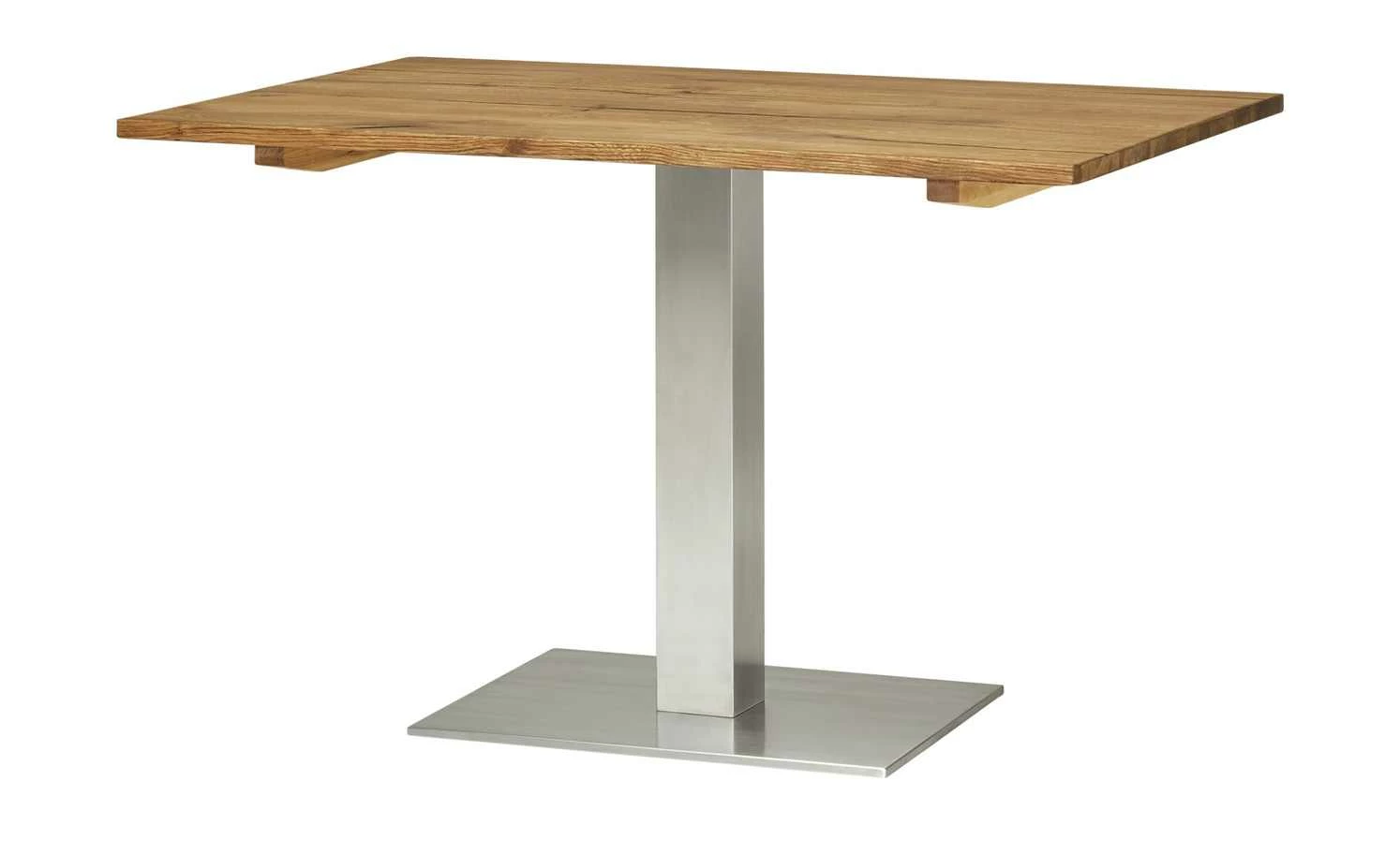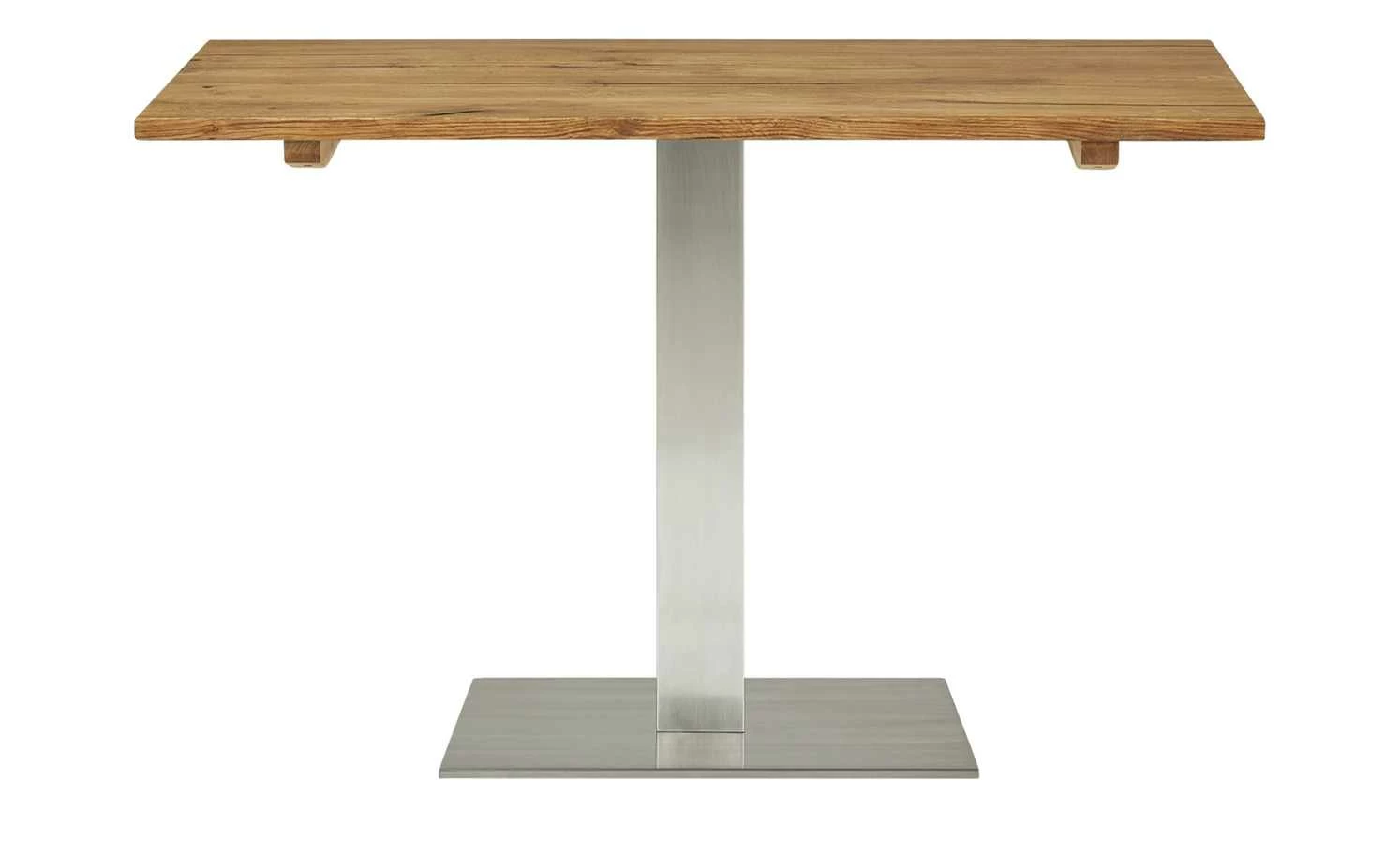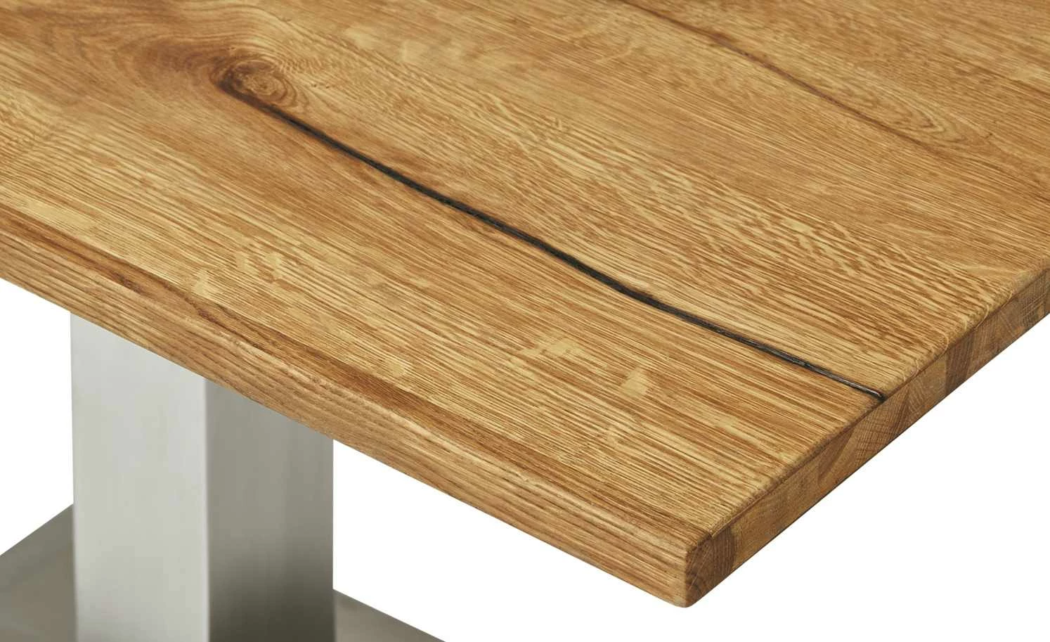 Massivholz und Metall lassen sich toll kombinieren. Das beweist der Esstisch Ferry. Die Tischplatte ist aus massivem Eichenholz. Die Oberfläche wurde geölt, um das Holz besser zu schützen. Die natürliche Maserung und Struktur sind dennoch gut zu erkennen. Unebenheiten und Risse im Holz sind gewollt und machen den besonderen Charme aus. Einen totalen Kontrast stellt das Gestell in Säulenform dar. Die Säule und die Bodenplatte sind beide aus gebürstetem Edelstahl.