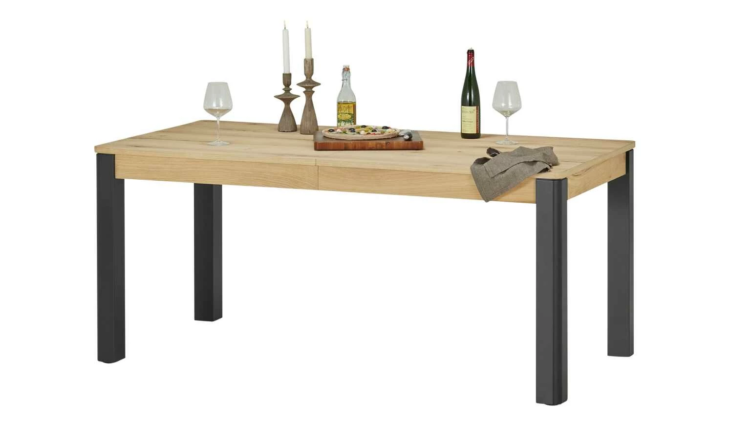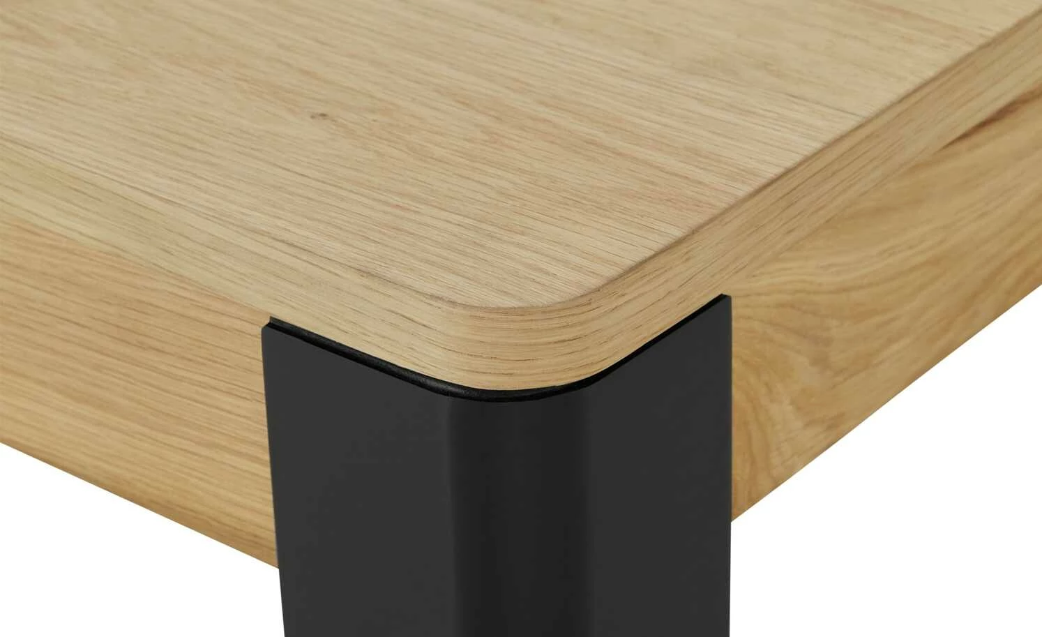- Mehr zum Material: Tischbeine aus MDF (Mitteldichte Holzfaserplatte) Schwarz lackiert, Tischplatte und Zarge aus Wildeiche natur furniert mit Wachseffektlack