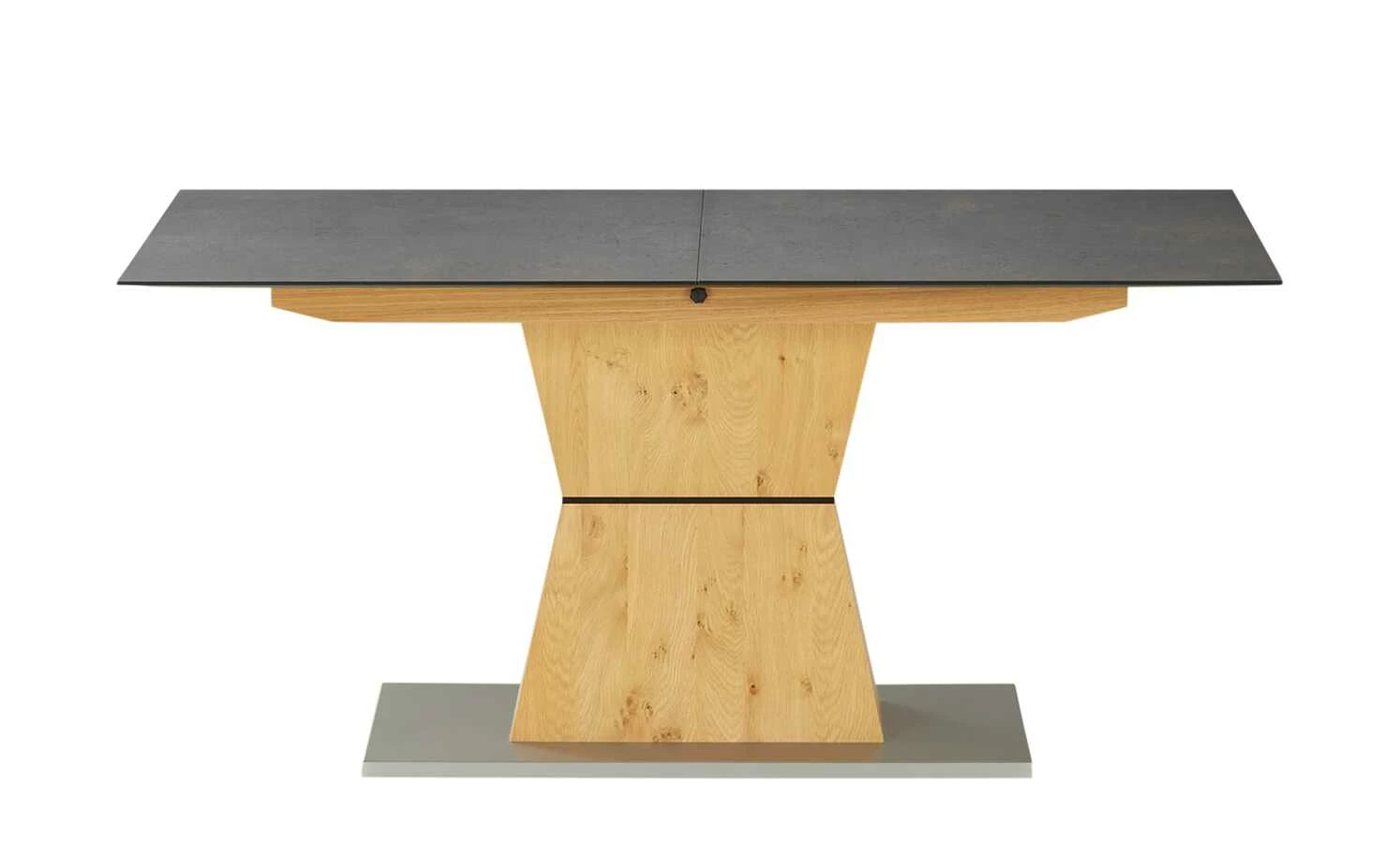 - Mehr zum Material: Bodenplatte lackiert in Edelstahl-Optik, Gestell: Charakter-Eiche furniert, Tischplatte aus HPL (High Pressure Laminate) in Granit-Design