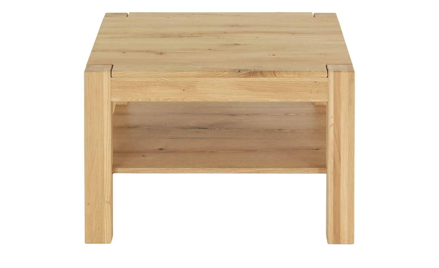 Der Couchtisch Oslo wirkt durch das verarbeitete Wildeichenholz natürlich und freundlich. Dadurch lässt er sich in zahlreiche Einrichtungsstile integrieren und kombinieren. Die 70 x 70 Zentimeter große Tischplatte wurde geölt und zeigt das Wildeichenholz von seiner besten Seite. Praktisch: Als zusätzliche Ablagemöglichkeit dient die Ablageplatte direkt unter der Tischplatte. Hier finden Zeitschriften und Co. Platz.