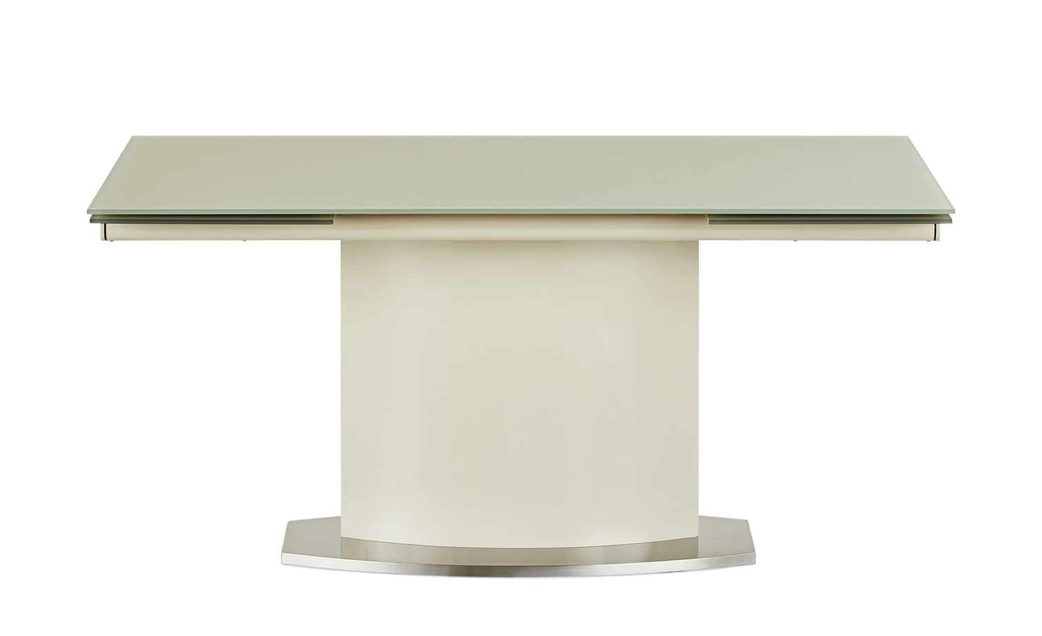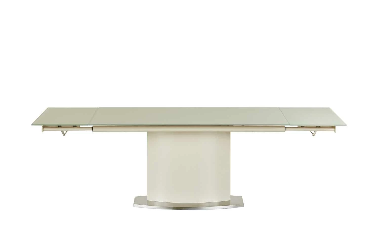 Den Esstisch Torres von uno können Sie auf bis zu 250 Zentimeter ausziehen. Der Kopfauszug macht es möglich. Im verlängerten Zustand bietet Torres Platz für bis zu zehn Personen. Die Tischplatte aus lackiertem Glas ruht auf einem Gestell in Säulenform. Der cappuccinobeige Farbton wird durch die Bodenplatte in Edelstahl abgesetzt. Sie hat ein edles, gebürstetes Finish.