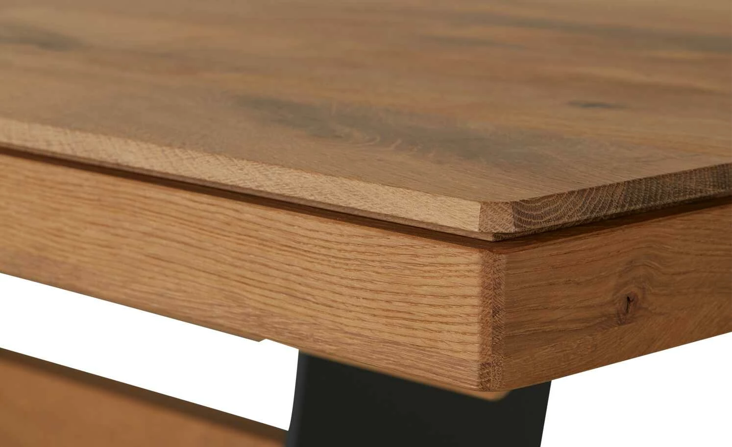 - Mehr zum Material: Applikation aus Baustahl, Anthrazit mit Holztraverse, Bodenplatte Metall, Anthrazit, Massivholz, Kerneiche Umato, gebürstet